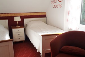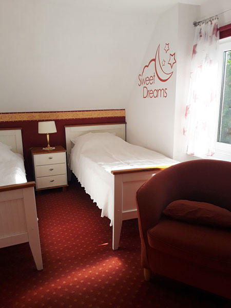 1 Kinderzimmer mit zwei Einzelbetten (1 x 2 m) und kleinerem Kleiderschrank, Kinderbett und Kinderstuhl sind vorhanden.