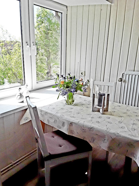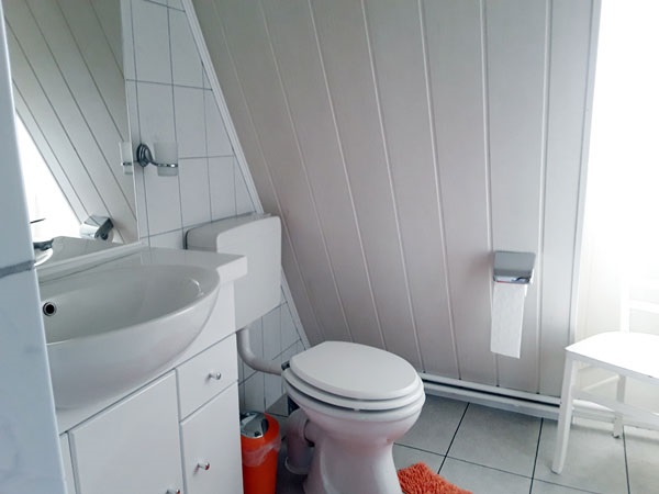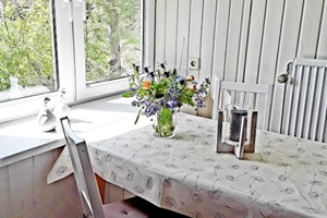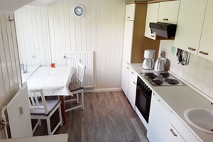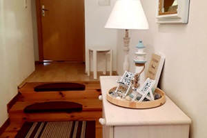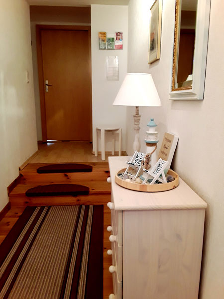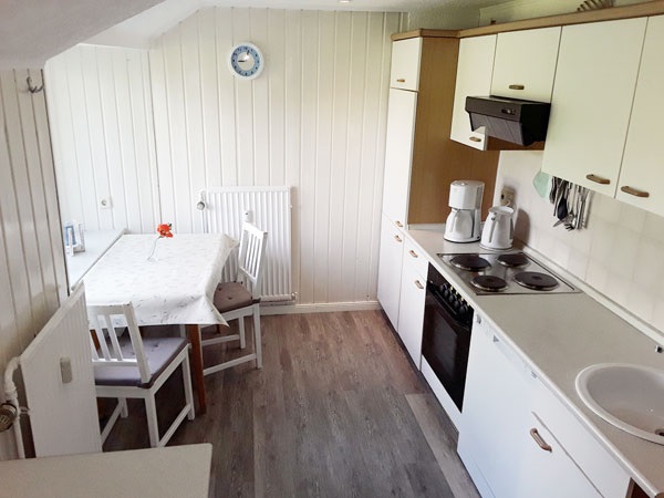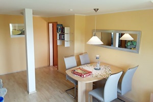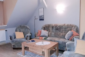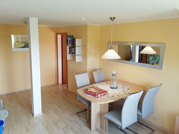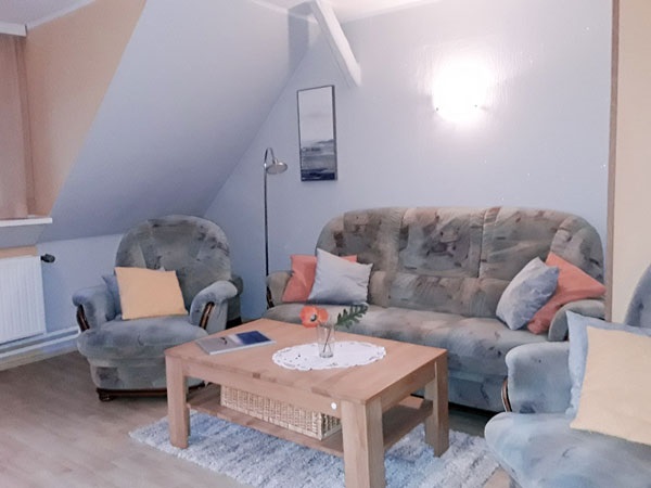 ist ca. 70 qm groß. Sie erreichen die Wohnung über einen separaten Eingang und einer Holztreppe. Ausgestattet ist die Wohnung für vier Personen mit einem Wohn- und Essraum mit Polstergarnitur, Essecke und Flachbild-TV